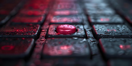 Magenta Button on Black Keyboard in a Business Setting: A Close-Up View. Concept Business Environment, Office Technology, Color Contrast, Close-up Photography, Modern Workspace