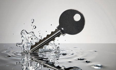 A single key makes a dramatic splash in dark water, captured in a striking black and white still.