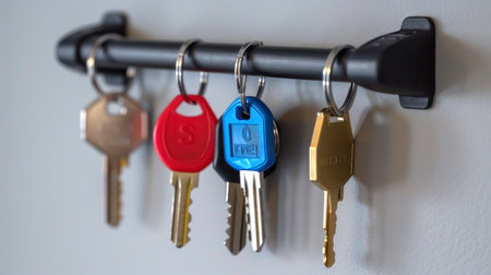 Various colored keys hanging on a key rack against a white background. Concept of security, organization, keyholder, home essentials, car keys.
