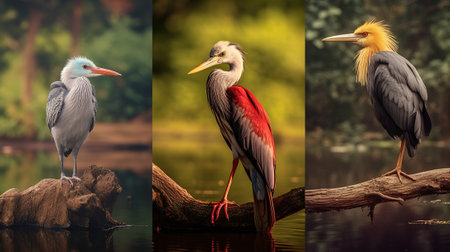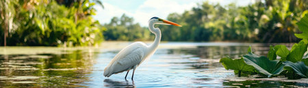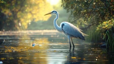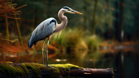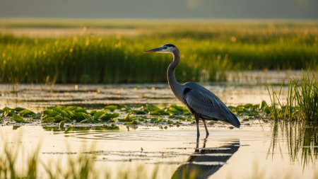 A majestic heron stands tall in a pristine wetland, its reflection shimmering in rippling waters amidst lush aquatic plants This serene wildlife photograph emphasizes the iconic beauty of nature and the importance of sustainability Discover the tranquil scene and join the movement for environmental conservation and appreciation of wildlife AI Generative