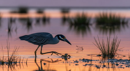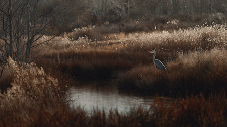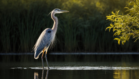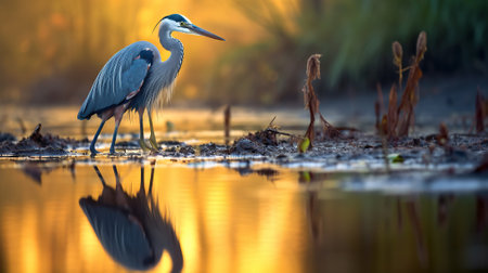 A regal great heron stands in shallow waters against a backdrop of lush reeds, the setting sun casting a warm glow over its elegant plumage.. AI Generation