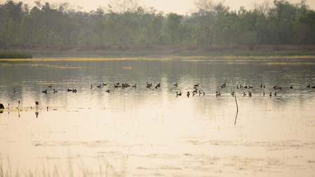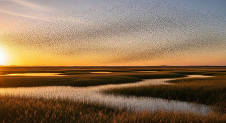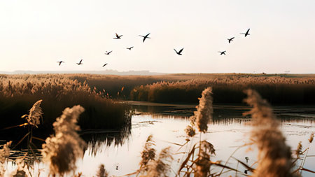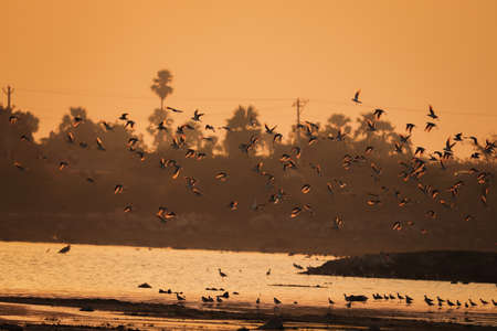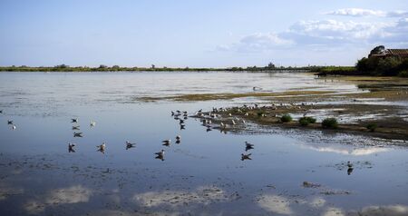 Panoramic view of a flock of birds in the natural park of Albufera at sunrise, Valencia, Spain.