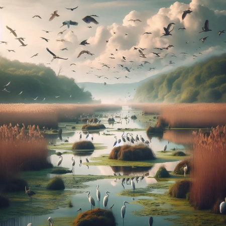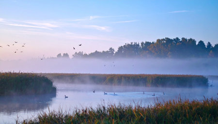 Early morning fog drifting over reed filled marshland, waterfowl silhouettes, soft pastel colors.