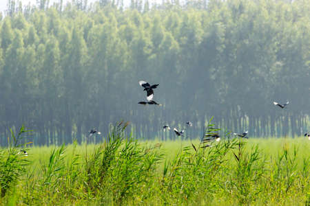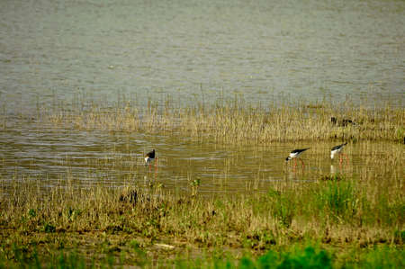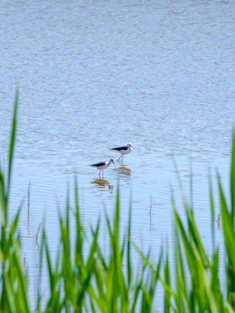 Black-winged lapwings on stilt legs search for food in shallow water on a sunny day against the backdrop of green grass. Bird life in the wild.