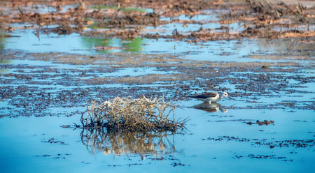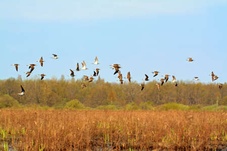 Birds on a spring meadow with green grass, flooded with water in Siberia. Bright blue sky.