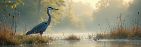 Majestic heron in tranquil misty wetland at dawn. That the image is generated using AI.