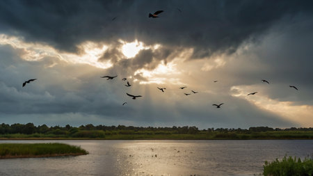 Seagulls flying over the lake at sunset, Baltic Sea, Poland
