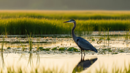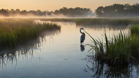 Great blue heron at sunrise in misty wetlands. That the image is generated using AI.