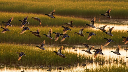 A nature reserve powered by renewable energy, with ducks flying across the early morning sky