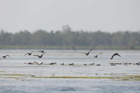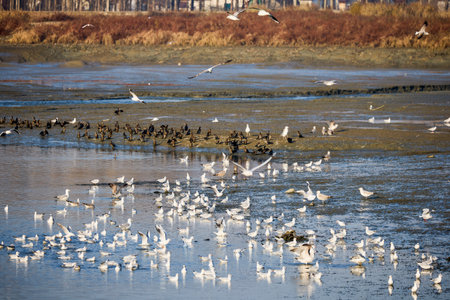 Colony of wild geese in the sea lagoon of Marano Lagunare in Friuli. Wild birds in the Valle Canal Novo nature reserve.