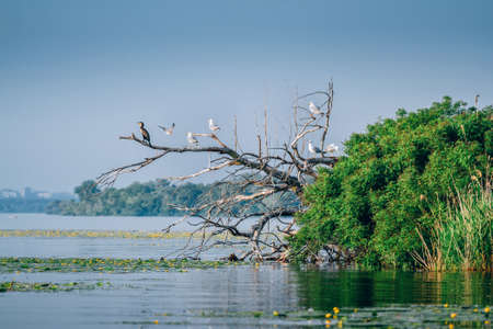 Beautiful landscape – calm river with reeds and blooming yellow water lily flowers on water surface and seagulls on a dry tree branches