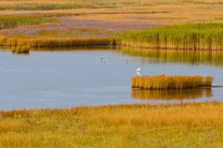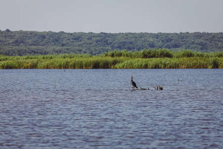 Plants and animals specific to the wetlands (reeds and sea birds) in the Neaslov Delta in Romania, very similar to the Danube Delta as seen from a running boat.