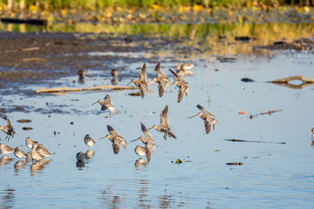A flock of Long-billed dowitchers making a landing. Vancouver BC Canada