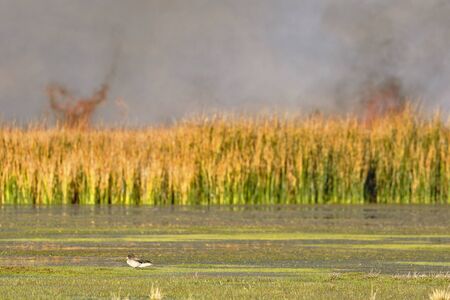 Detail of fire of reeds inside the lake JunÃn in Ondores, that damages the habitat of the birds that live there
