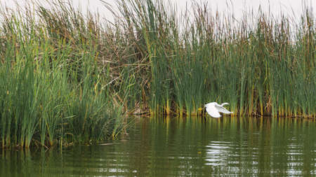 Garza Blanca bird flying over a lagoon surrounded by totora plants in Pantanos de Villa Chorrillos Lima Peru