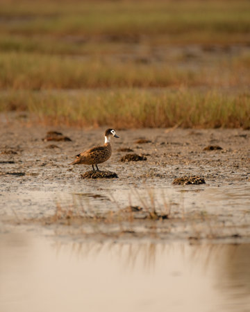 A lone beautiful Andaman Teal standing on a small dirt mound in the field late afternoon on the south of the Andaman Islands. They are also called Anas albogularis.