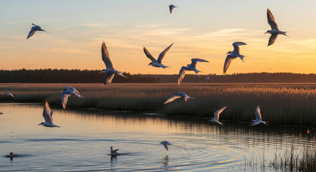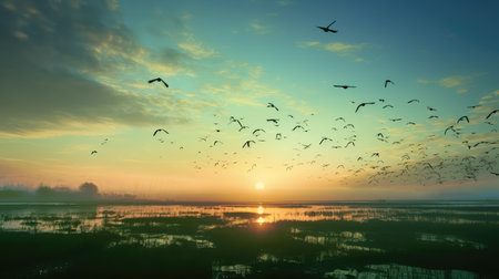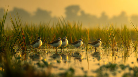 Dawn's gentle light illuminates a serene wetland where tiny shorebirds forage quietly, creating a peaceful scene of nature?s early morning harmony.