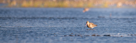 Black-tailed godwit (limosa limosa) hunting alone in shallow waters of the lagoon at Mnnar, Sri Lanka.