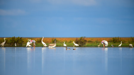 Shallow water on Maliy Sasik Lake. Small cluster of seagulls on Maliy Sasik Lake