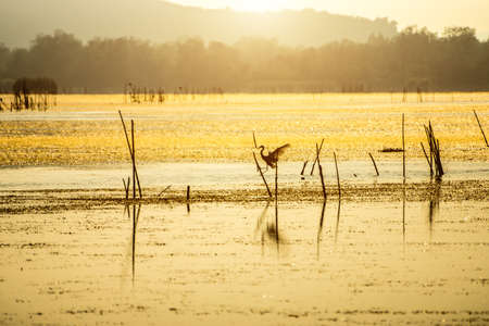 Grey heron (Ardea cinerea) in the wetlands at sunset