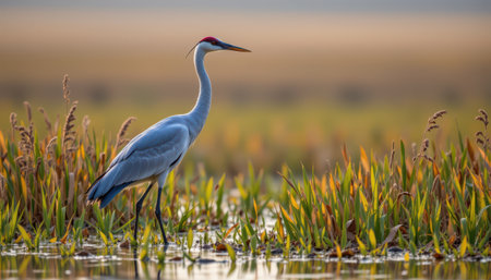 Majestic Crane Walking Through Lush Marshland with Colorful Reeds at Sunrise, Capturing the Serenity of Nature in Soft Light and Vivid Colors