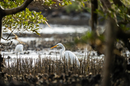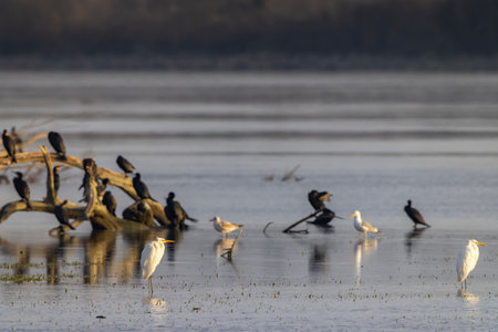 Great egrets and cormorants resting in the shallow waters of the rhone river near Codolet, in Gard, France