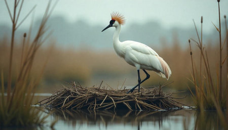 timeless crane photographed in a standing pose in a reedy marsh, in a classic wildlife photography style, with soft gray tones, early morning light, high resolution