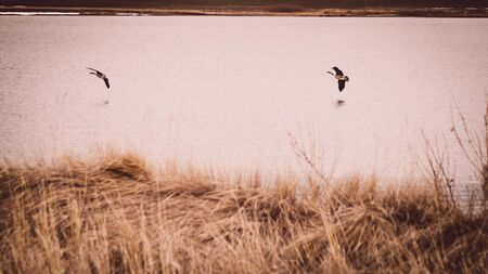 Two geese fly near a grassy lake shore in the Spring. The sunset and dried grass look like Autumn on this chilly evening.