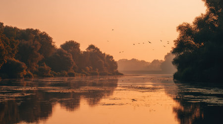 A tranquil river scene at sunrise, showcasing misty reflections and silhouetted trees. This peaceful setting captures the beauty of nature and serenity.