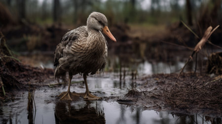 big bird standing near a water feature, captured in the atmospheric woodland style of michael shainblum. this macro photograph, reminiscent of adrianus eversen's work, showcases the moody colors and the intricate details of the bird. a stunning national geographic-worthy image with a touch of grisaille. ai generated