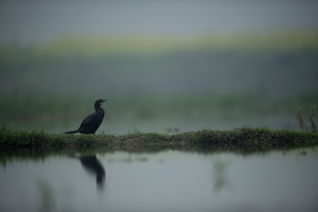 Serene heron and little bird at misty dawn wetland. That the image is generated using AI.
