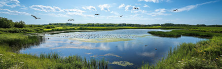 The Horicon Marsh comes alive at sunrise with calm waters reflecting the sky. Birds glide gracefully overhead as lush greenery surrounds the serene landscape.