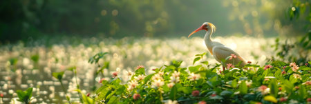 Stork wading in serene misty wetlands at sunrise. That the image is generated using AI.