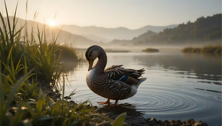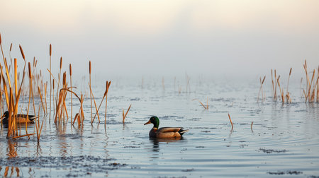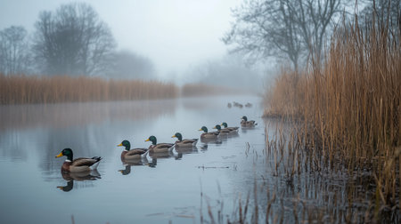 A serene morning with ducks swimming through a foggy wetland at dawn near a tranquil riverbank surrounded by tall grasses