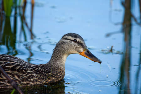 A brown wild duck swimming in a pond, river, lake with blue-brown water. Feathered waterfowl. A cute bird with a black beak. Wild Mallard reflected on the surface of the water in a body of fresh water
