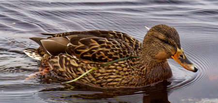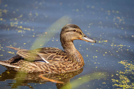 Female mallard duck swimming in the lake. Shallow depth of field.
