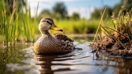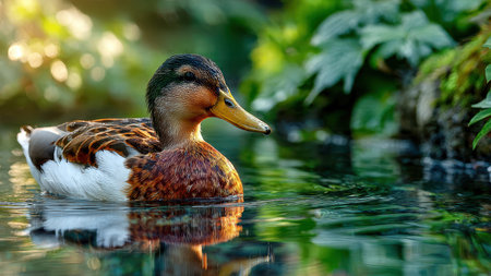 AI Generated. Duck gliding gracefully across tranquil pond waters surrounded by greenery in late afternoon sunlight