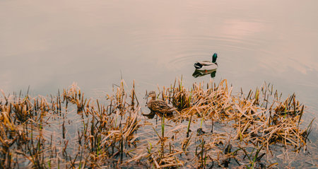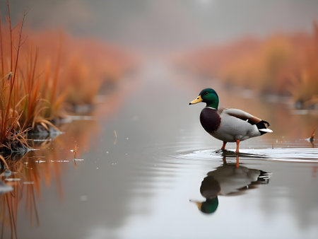 Mallard duck foraging in shallow water of a tranquil pond during golden hour
