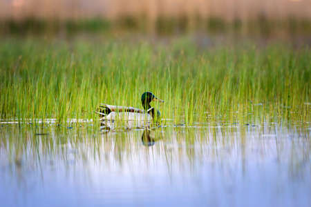 A close-up mallard duck swims and peels feathers with its beak. Natural photography with wild birds. Beauty in nature. Warm spring day
