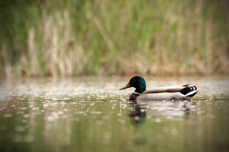 Male mallard duck swimming peacefully in a tranquil pond surrounded by greenery at sunset