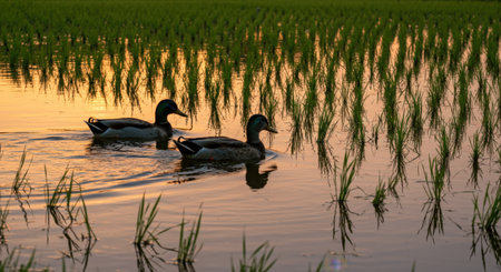 Ducks swimming in a rice field in sunlight at sunset in summer