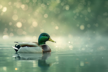 Mallard Duck Floating on Serene Water with Bokeh Lights