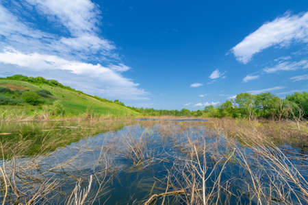 Countryside in early spring. A small lake on a sunny day with clear blue sky. Nature landscape
