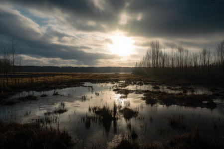 muddy marsh, with the sun peeking through clouds and shining on the water, created with generative ai