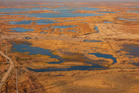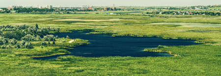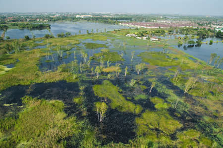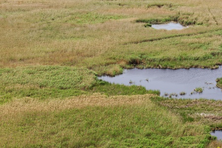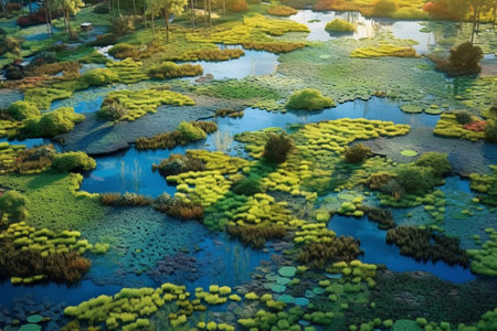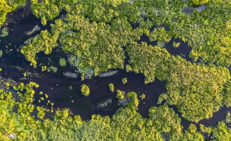 view from height of the water and vegetation of the swampy area, greenery with water spots, view from the drone