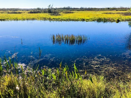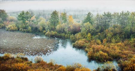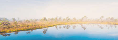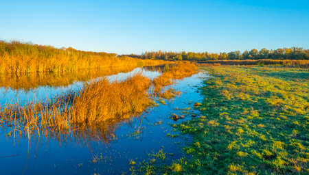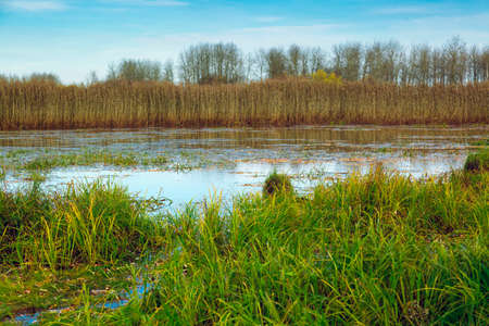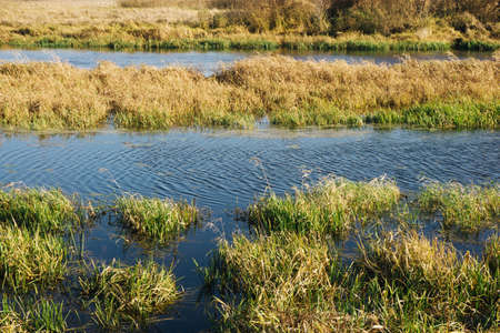 River landscape. Wetland background. Autumn outdoor sunny day. Wet swamp ground landscape. National Park scenic view. Podlasie region in Poland. Biebrzanski National Park.