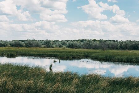 summer photography, a river overgrown with reeds, blue sky with white clouds, blue water covered with duckweed, river floodplain, sultry summer day