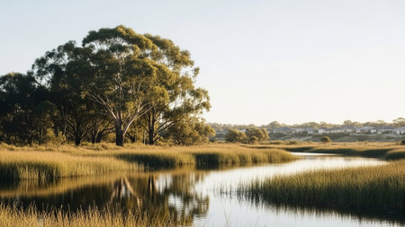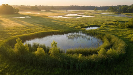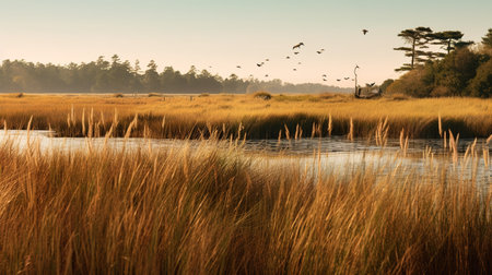 A tranquil marsh scene at dawn with a misty atmosphere. The still water reflects the golden grass and trees, creating a serene outdoor landscape. Perfect for nature lovers.