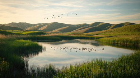 A tranquil landscape featuring a calm waterbody reflecting the sky, with birds flying overhead and lush greenery surrounding the scene, perfect for serene nature photography.