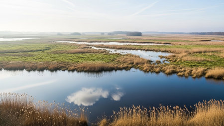 Generative AI : Aerial view of grassland and marsh in nature reserve Hoeksmeer province of Groningen The Netherlands